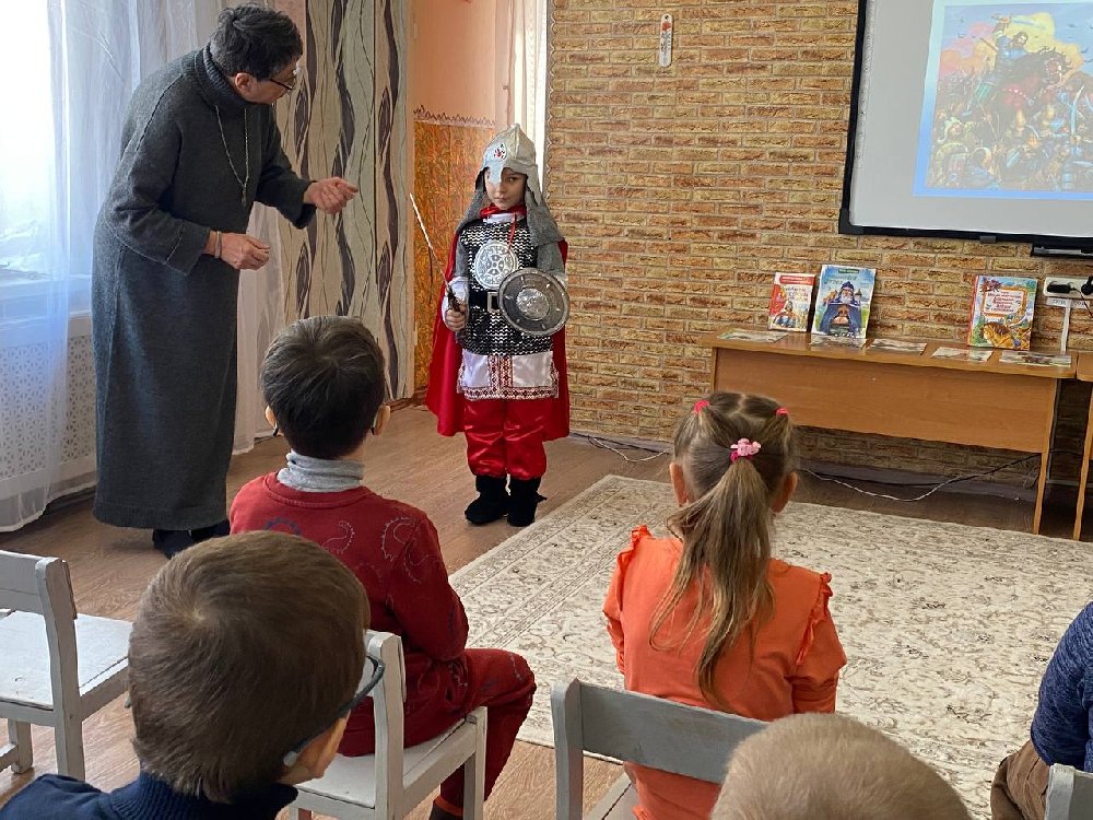 В рамках работы по духовно-нравственному воспитанию и историческому просвещению в ГБДОУ № 3 "Ягодка" прошли Минутки Духовности для воспитанников старшего дошкольного возраста на тему: "Святые воины Руси: Илья Муромец". Ребята посмотрели видеоклип на основе художественного фильма, а также фрагмент мультфильма о богатыре Илье Муромце, послушали в записи исполнение старинной былины на гуслях, рассмотрели слайды мультимедийной презентация, иллюстрации в книгах для детей. Педагоги рассказали малышам о жизни Ильи Муромца, о тяжёлом недуге и чудесном исцелении, о силе богатырской и победах, о пленении Соловья-разбойника. Особый интерес у детей вызвал гость в костюме богатыря, можно было рассмотреть его доспехи и оружие, поучаствовать в богатырской разминке. Ребята узнали о том, что много лет Илья Муромец охранял землю русскую, а после службы стал монахом. Дети рассуждали о том, что сила невиданная, богатырская была дана Илье Муромцу на добрые дела - защиту своей Отчизны. Не забыла Русь Святая славного и храброго защитника родной земли богатыря Илью Муромца! Не бывать врагам на нашей земле, не топтать им конями землю русскую, пока не перевелись на Руси такие богатыри. Илья Муромец не просто герой, он прославлен Православной церковью как святой воин и служит примером для всех защитников России.